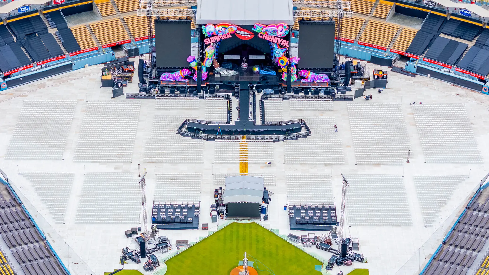 For P!NK’s September 2024 concert at Dodger Stadium, Hundred House was tasked with installing 10,000 chairs, each tied, tagged, and aligned precisely to a detailed seating diagram. Every row, aisle, and seat number had to match paid ticket assignments exactly.