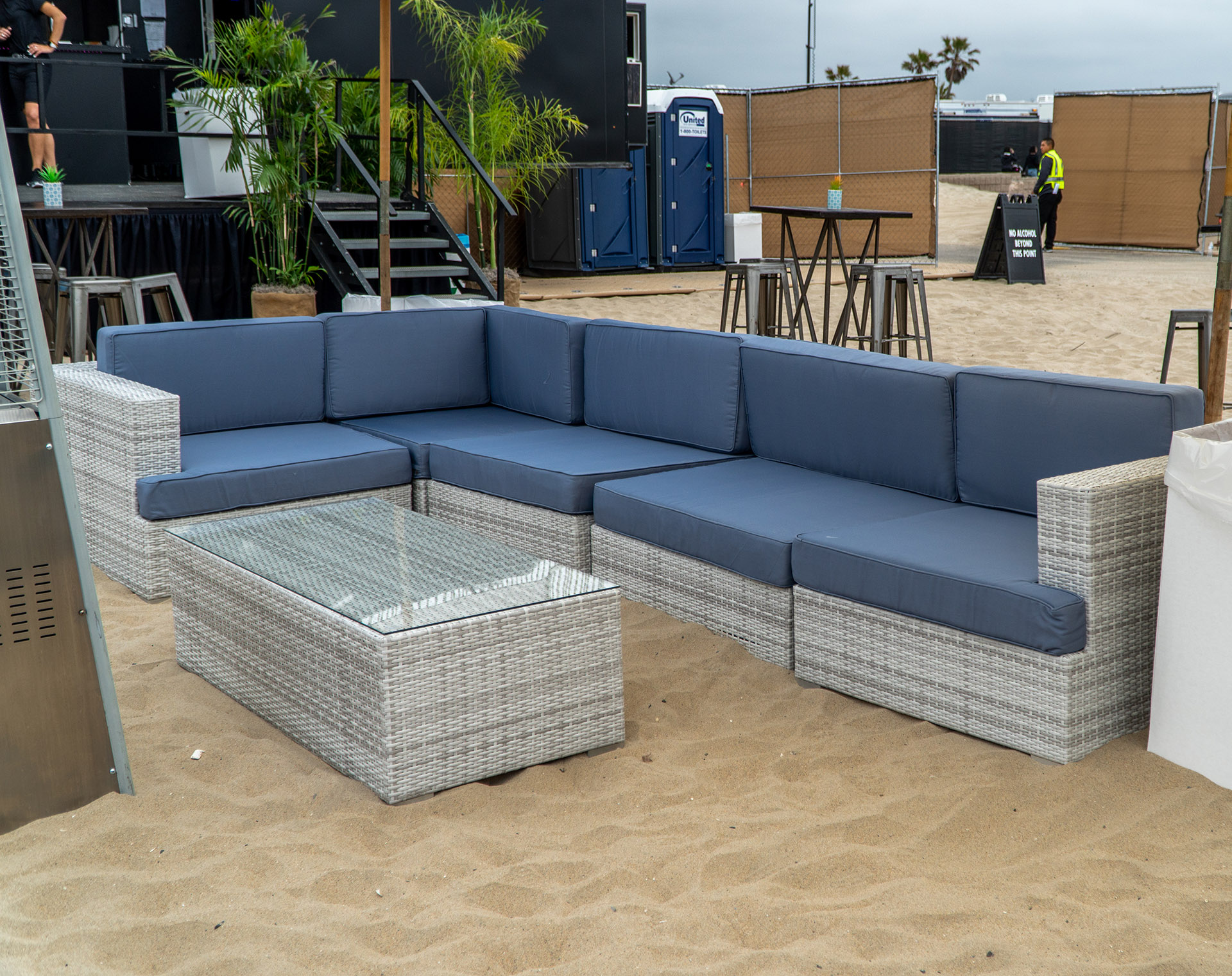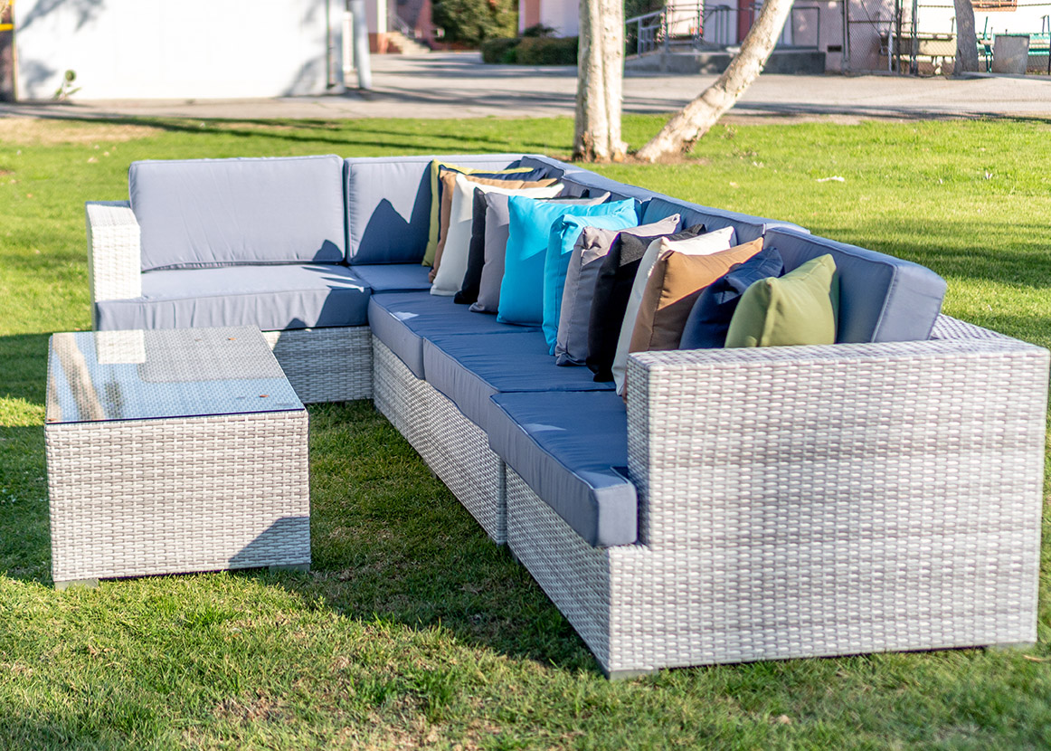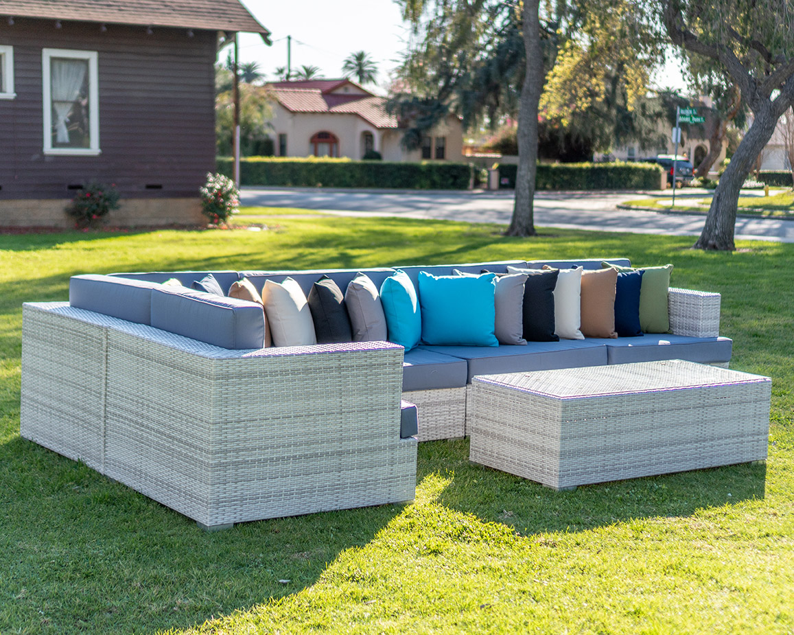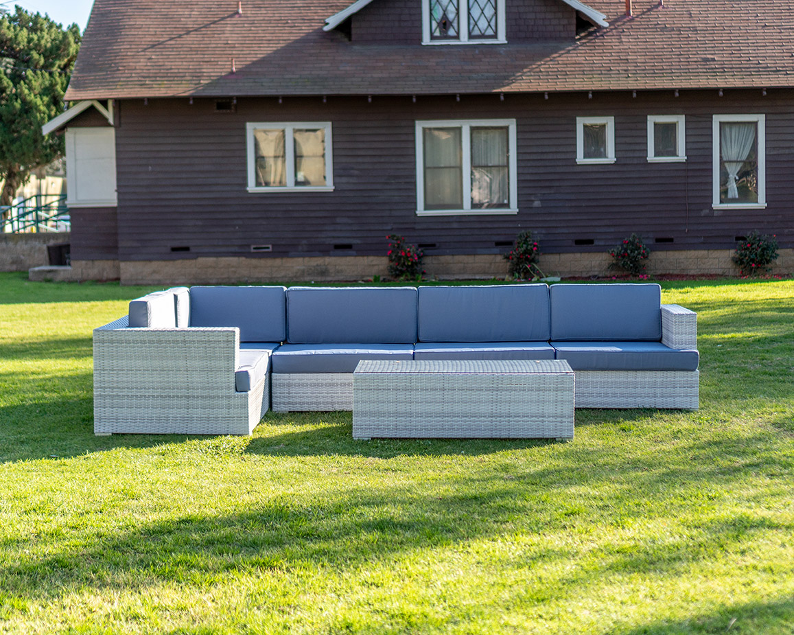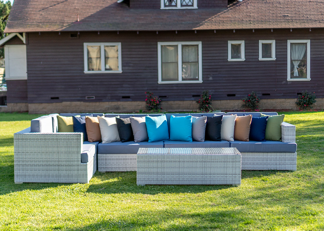 Enhance your outdoor event with our Lounge Sectional Montecito 8-piece set in White And Grey. Designed for comfort and versatility, this sectional provides ample seating for guests to relax and socialize under the open sky.