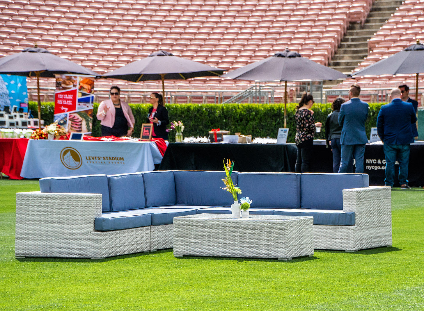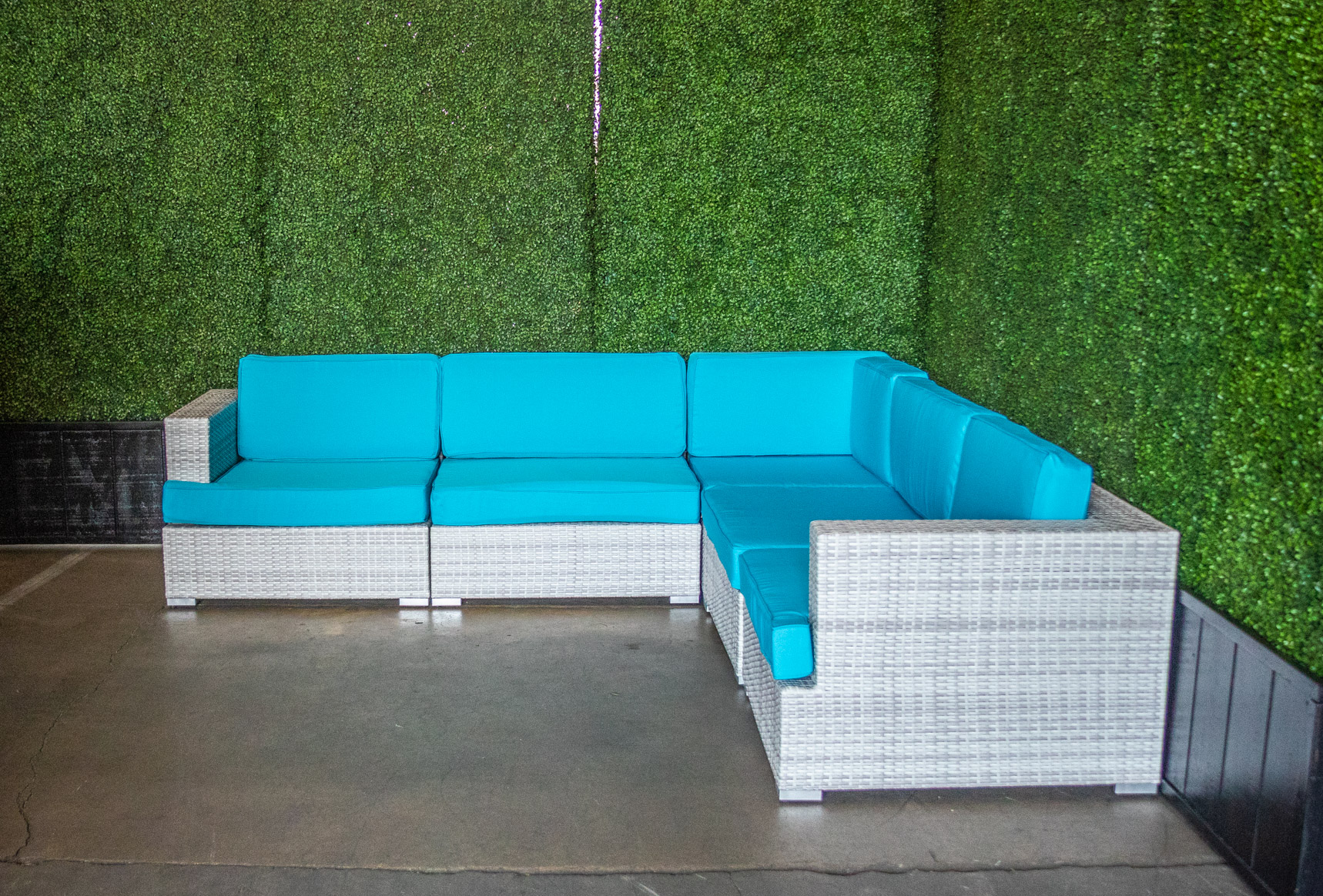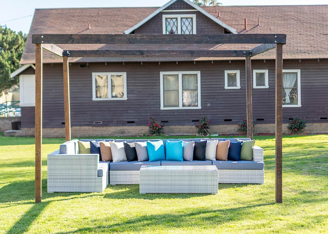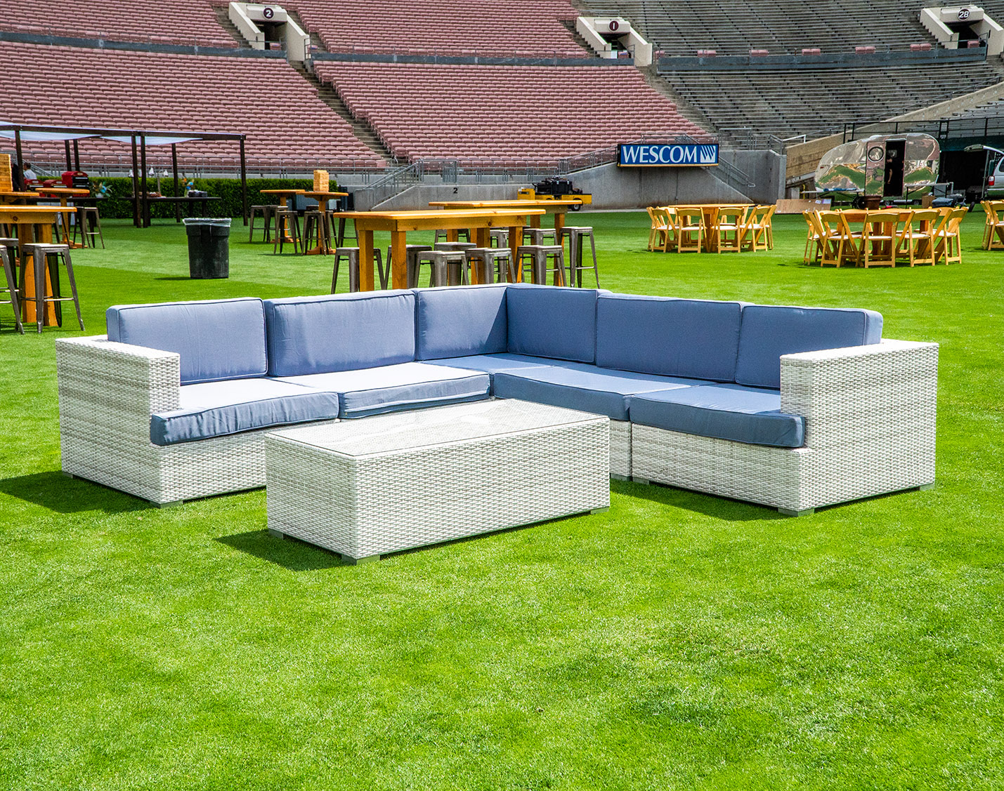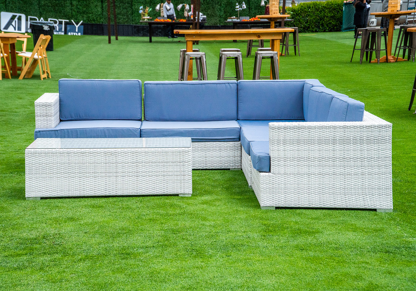 Enhance your outdoor event with our Lounge Sectional Montecito 8-piece set in White And Grey. Designed for comfort and versatility, this sectional provides ample seating for guests to relax and socialize under the open sky.